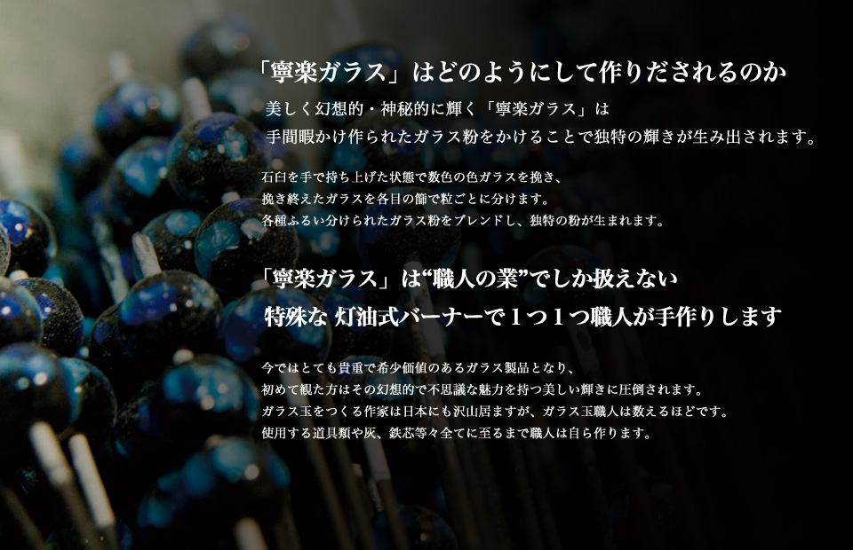 灯油式バーナーをつくる職人さえも今は数えるほどしかいません。煤が入りにくく、カロリーが強い灯油バーナーを使用することによってガラスに照りが出ます。また風などの影響で少しでも悪い火になれば作れません。火の加減、粉を散らす火の中の位置、当て方、感覚、視覚など「寧楽ガラス」の製作は全てが必要とされます。